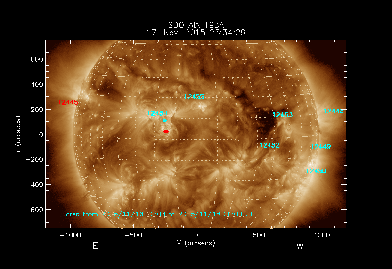 The most recent flares (≤12 hours) are shown as red dots, 12-24 hours ago as blue dots and older ones as turquoise dots.