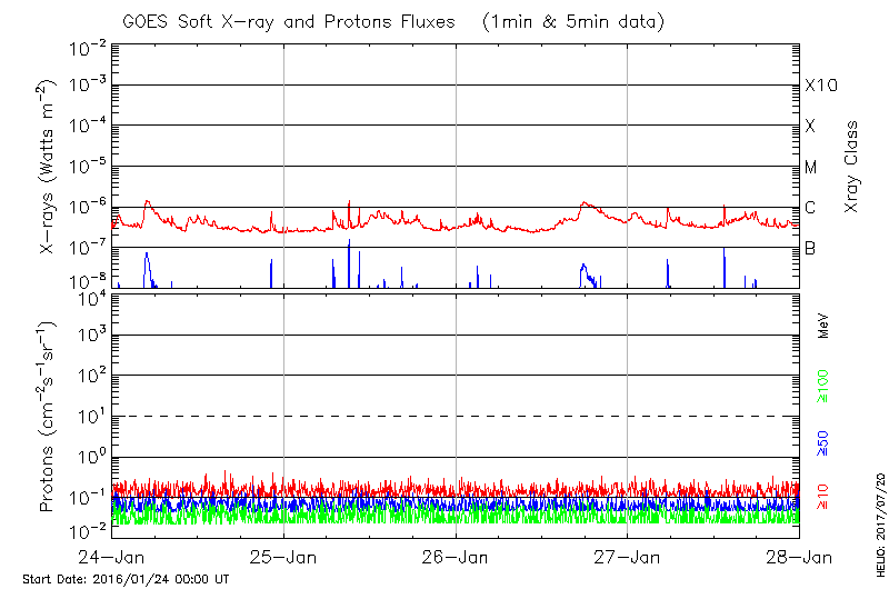This page provides light-curves generated from GOES soft X-ray and Particle data for the date indicated at the top and the preceding three days.