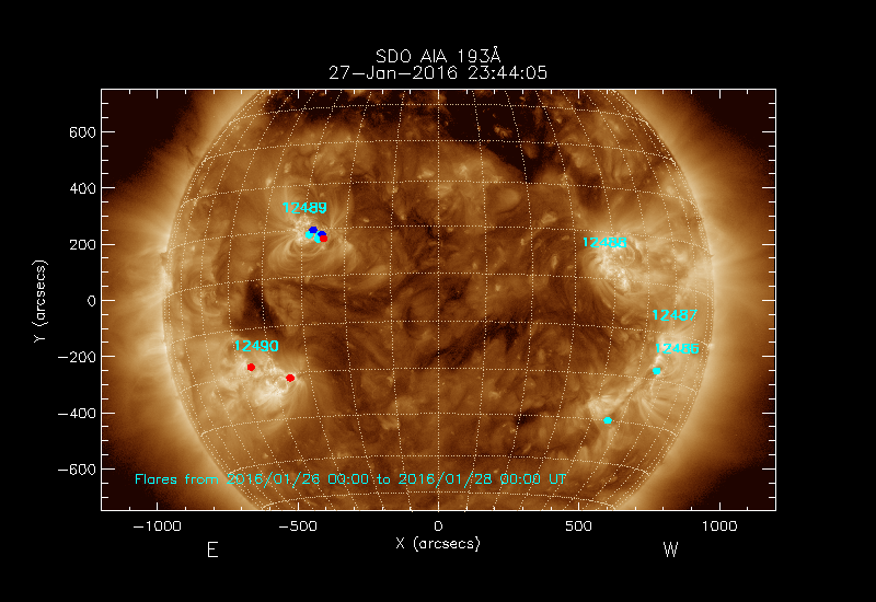 The most recent flares (≤12 hours) are shown as red dots, 12-24 hours ago as blue dots and older ones as turquoise dots.