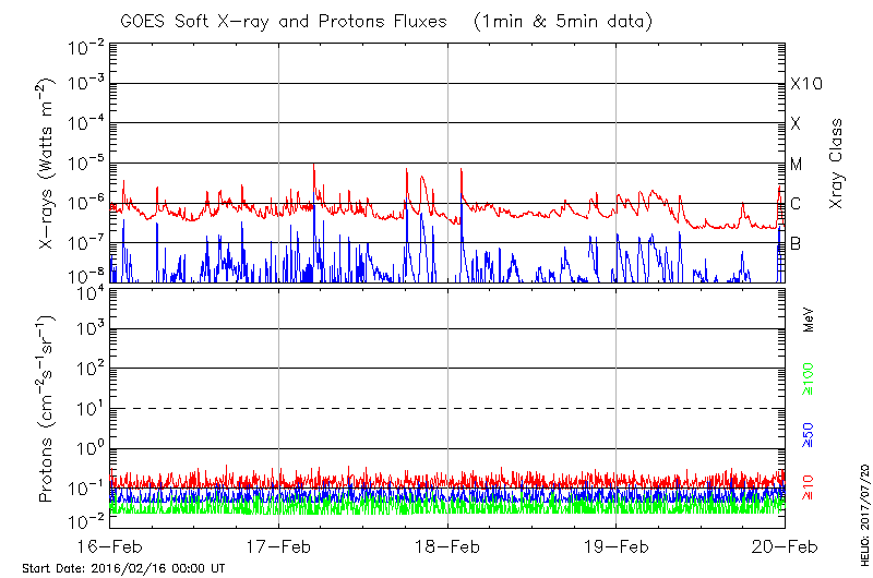 This page provides light-curves generated from GOES soft X-ray and Particle data for the date indicated at the top and the preceding three days.