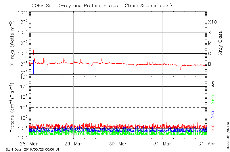 This page provides light-curves generated from GOES soft X-ray and Particle data for the date indicated at the top and the preceding three days.