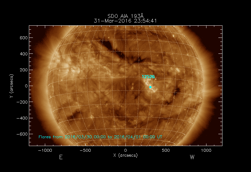 Flares for the 48 hours leading up to the time are over-plotted; these are rotated to the time of the FITS image.