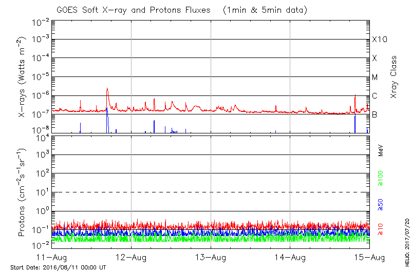 This page provides light-curves generated from GOES soft X-ray and Particle data for the date indicated at the top and the preceding three days.