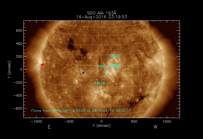 Click on an Active Region plot to display the Region Report including the region evolution and flaring history. HEC Search for NOAA Active Regions (SRS) records for this date and the day before.