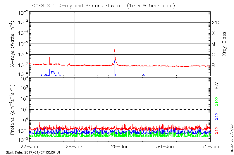 This page provides light-curves generated from GOES soft X-ray and Particle data for the date indicated at the top and the preceding three days.