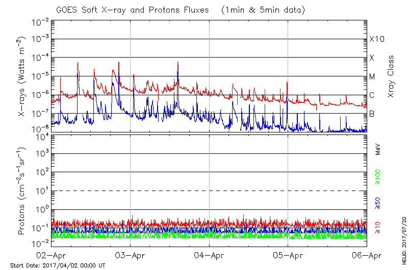 This page provides light-curves generated from GOES soft X-ray and Particle data for the date indicated at the top and the preceding three days.