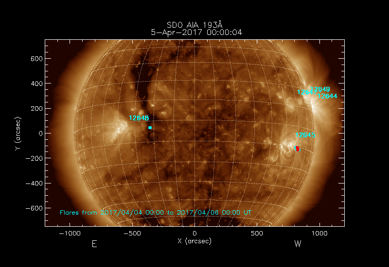 The locations of the flares over-plotted on the image are derived from the flare catalogue