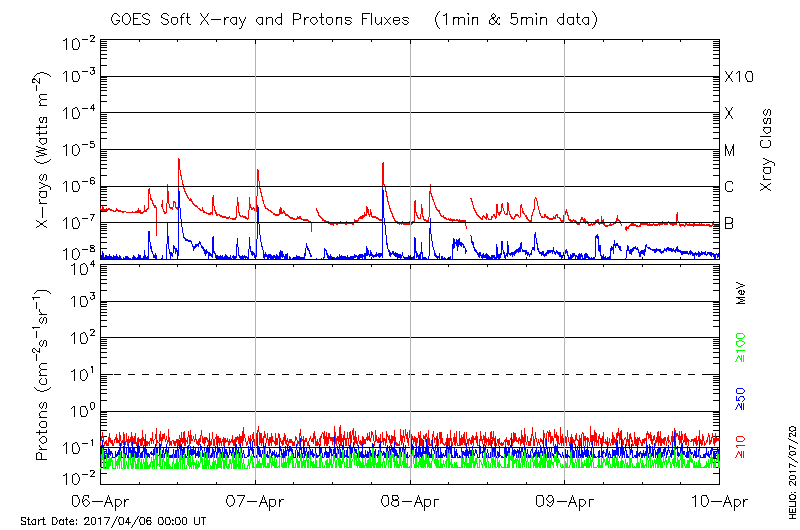 This page provides light-curves generated from GOES soft X-ray and Particle data for the date indicated at the top and the preceding three days.