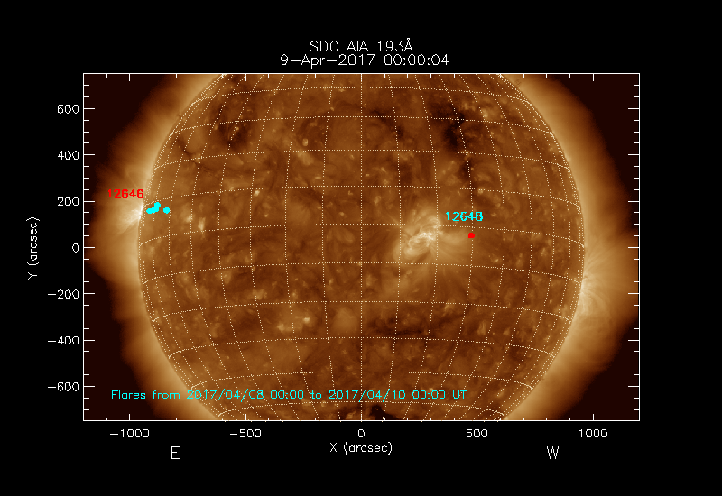 The locations of the flares over-plotted on the image are derived from the flare catalogue
