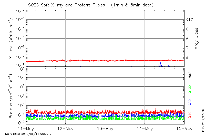 This page provides light-curves generated from GOES soft X-ray and Particle data for the date indicated at the top and the preceding three days.