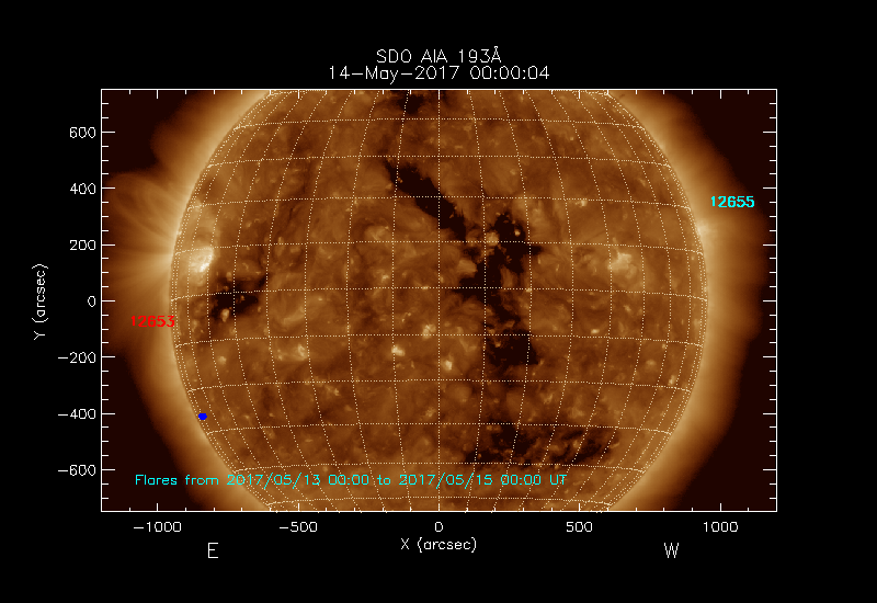 Click on an Active Region plot to display the Region Report including the region evolution and flaring history. HEC Search for NOAA Active Regions (SRS) records for this date and the day before.