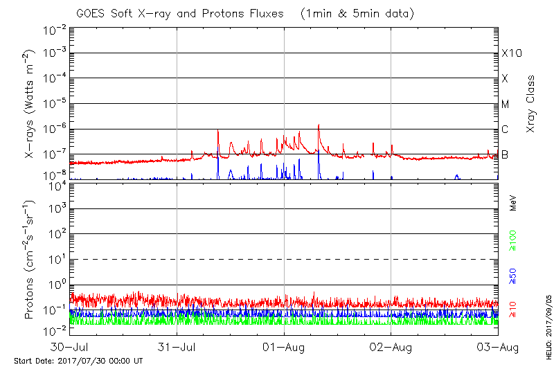This page provides light-curves generated from GOES soft X-ray and Particle data for the date indicated at the top and the preceding three days.