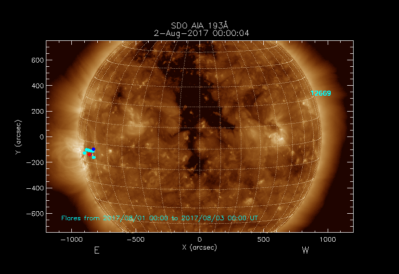 The most recent flares (≤12 hours) are shown as red dots, 12-24 hours ago as blue dots and older ones as turquoise dots.