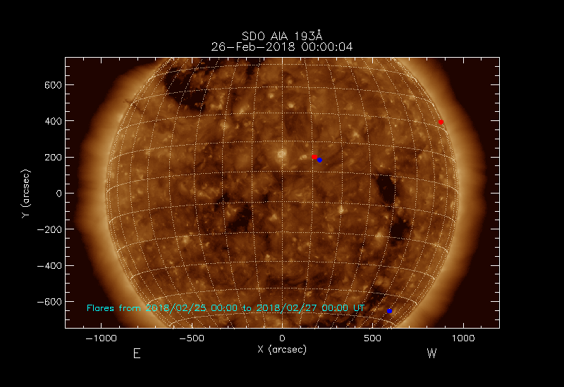 The most recent flares (≤12 hours) are shown as red dots, 12-24 hours ago as blue dots and older ones as turquoise dots.