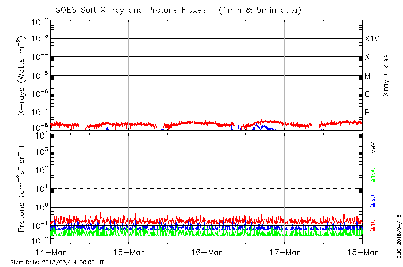 This page provides light-curves generated from GOES soft X-ray and Particle data for the date indicated at the top and the preceding three days.