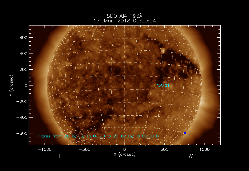 Click on an Active Region plot to display the Region Report including the region evolution and flaring history. HEC Search for NOAA Active Regions (SRS) records for this date and the day before.