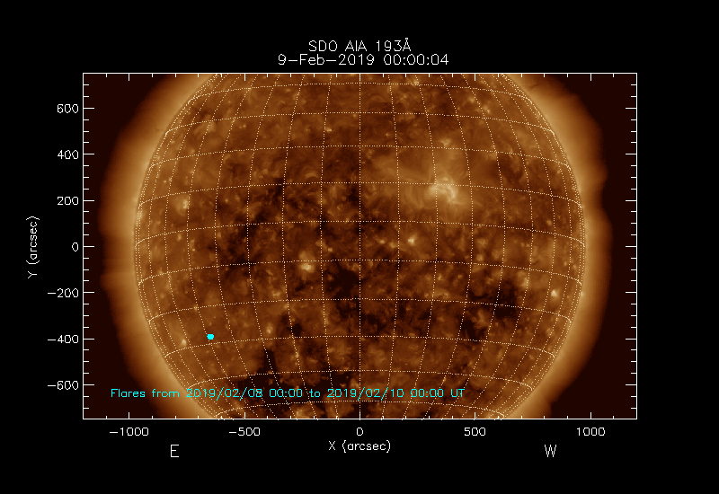 Flares for the 48 hours leading up to the time are over-plotted; these are rotated to the time of the FITS image.