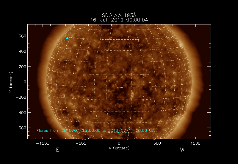 The locations of the flares over-plotted on the image are derived from the flare catalogue
