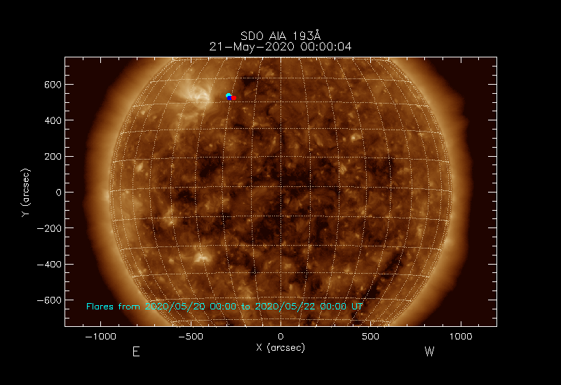 The locations of the flares over-plotted on the image are derived from the flare catalogue