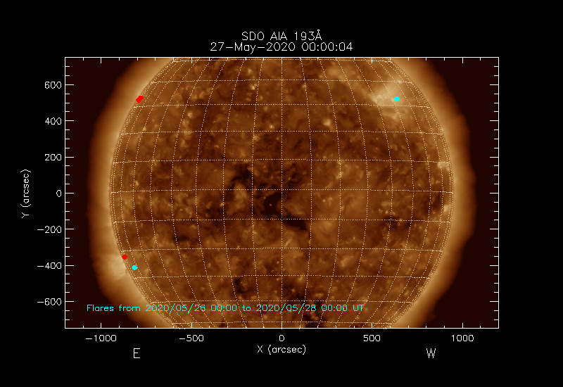 The most recent flares (≤12 hours) are shown as red dots, 12-24 hours ago as blue dots and older ones as turquoise dots.