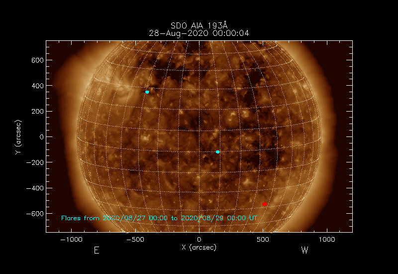 The most recent flares (≤12 hours) are shown as red dots, 12-24 hours ago as blue dots and older ones as turquoise dots.