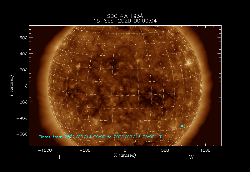 Flares for the 48 hours leading up to the time are over-plotted; these are rotated to the time of the FITS image.