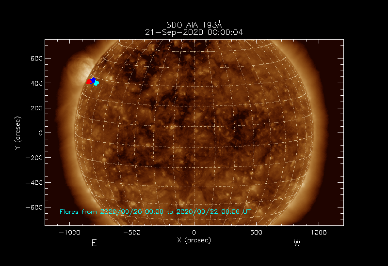 The most recent flares (≤12 hours) are shown as red dots, 12-24 hours ago as blue dots and older ones as turquoise dots.
