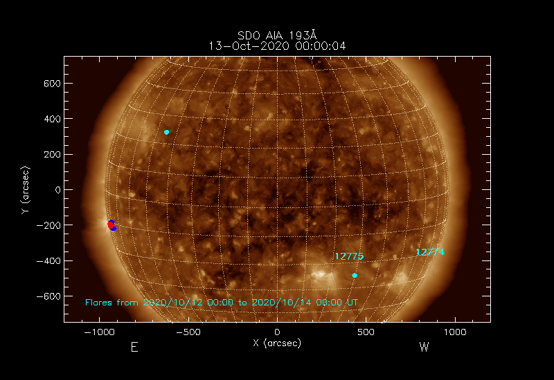 The most recent flares (≤12 hours) are shown as red dots, 12-24 hours ago as blue dots and older ones as turquoise dots.