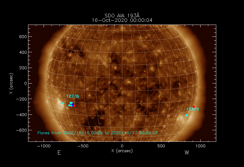 The most recent flares (≤12 hours) are shown as red dots, 12-24 hours ago as blue dots and older ones as turquoise dots.