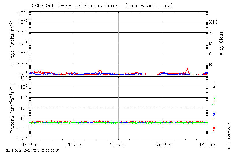 This page provides light-curves generated from GOES soft X-ray and Particle data for the date indicated at the top and the preceding three days.