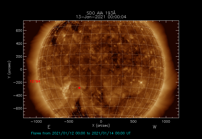 Click on an Active Region plot to display the Region Report including the region evolution and flaring history. HEC Search for NOAA Active Regions (SRS) records for this date and the day before.
