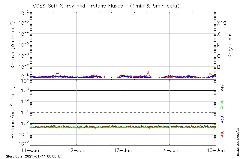 This page provides light-curves generated from GOES soft X-ray and Particle data for the date indicated at the top and the preceding three days. The designated date is the right most panel; the locations shown on the Flare Locations page are covered in the two right hand panels.