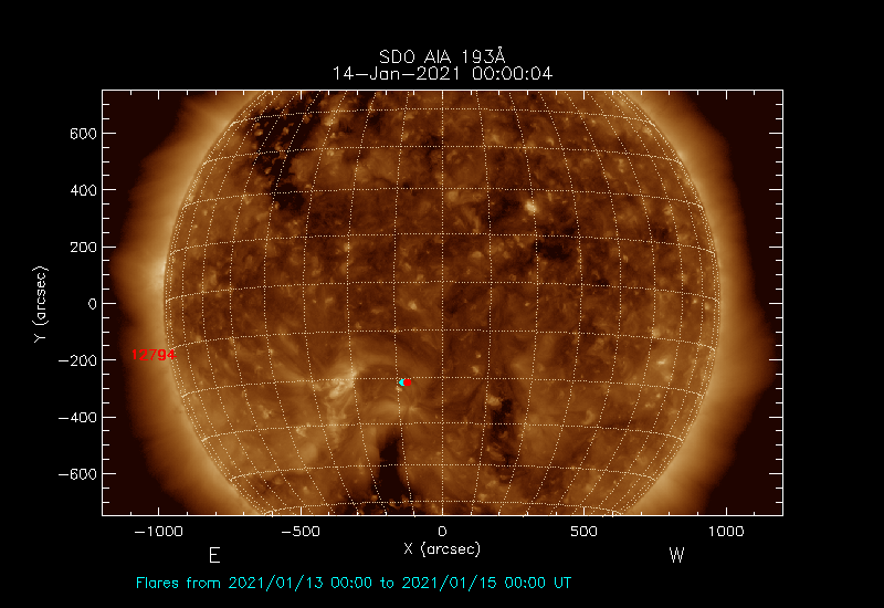 An image is created every 6 hours using the closest available FITS file to this time that can be found. The time interval coverered by the image is indicated in the bottom left hand corner. Flares for the 48 hours leading up to the time are over-plotted; these are rotated to the time of the FITS image.