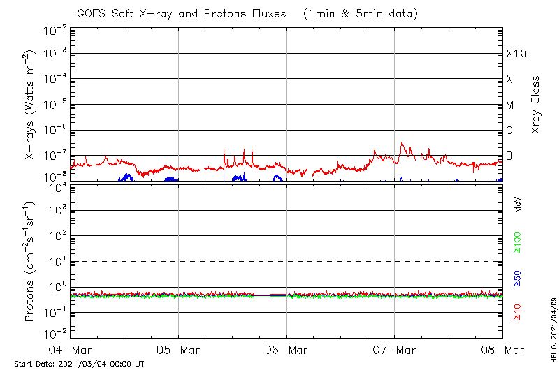 This page provides light-curves generated from GOES soft X-ray and Particle data for the date indicated at the top and the preceding three days. The designated date is the right most panel; the locations shown on the Flare Locations page are covered in the two right hand panels.