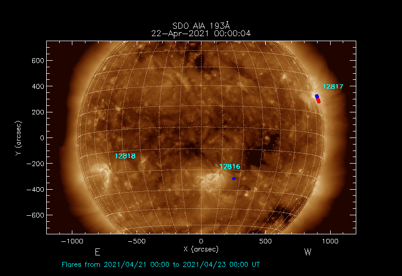 The most recent flares (≤12 hours) are shown as red dots, 12-24 hours ago as blue dots and older ones as turquoise dots.