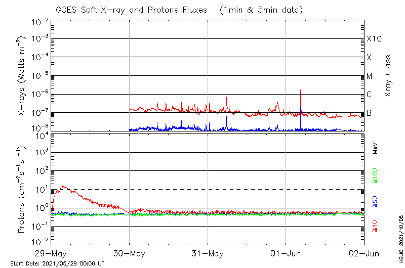 This page provides light-curves generated from GOES soft X-ray and Particle data for the date indicated at the top and the preceding three days.