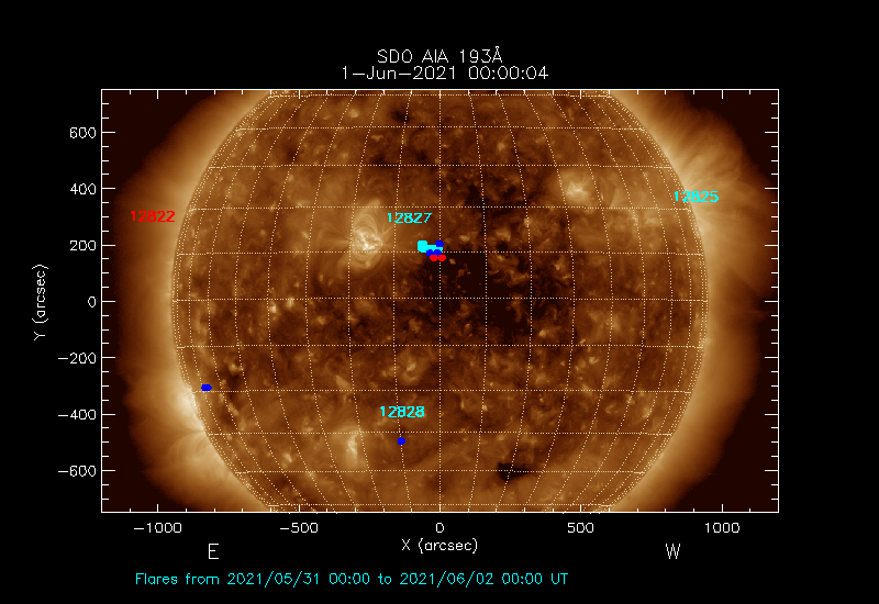 Click on an Active Region plot to display the Region Report including the region evolution and flaring history. HEC Search for NOAA Active Regions (SRS) records for this date and the day before.