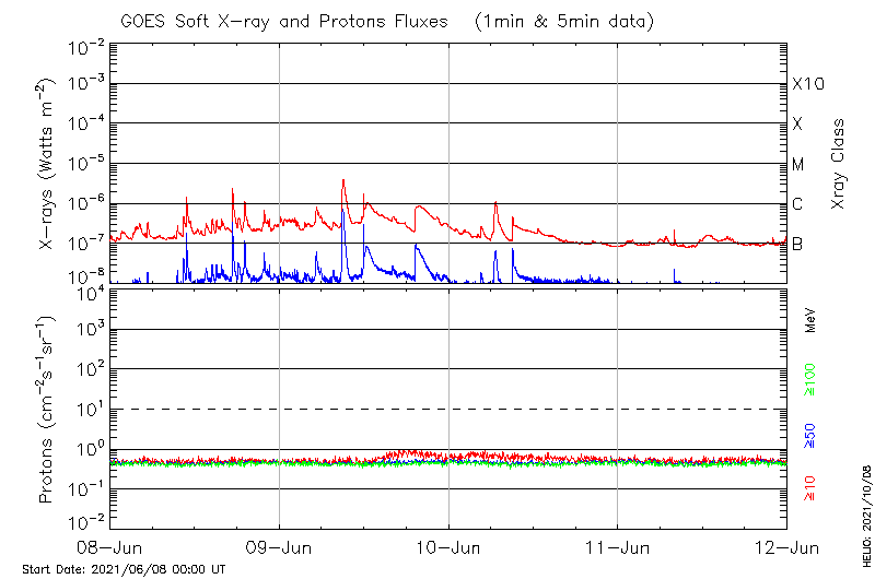 This page provides light-curves generated from GOES soft X-ray and Particle data for the date indicated at the top and the preceding three days.