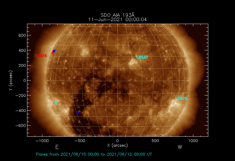 The most recent flares (≤12 hours) are shown as red dots, 12-24 hours ago as blue dots and older ones as turquoise dots.