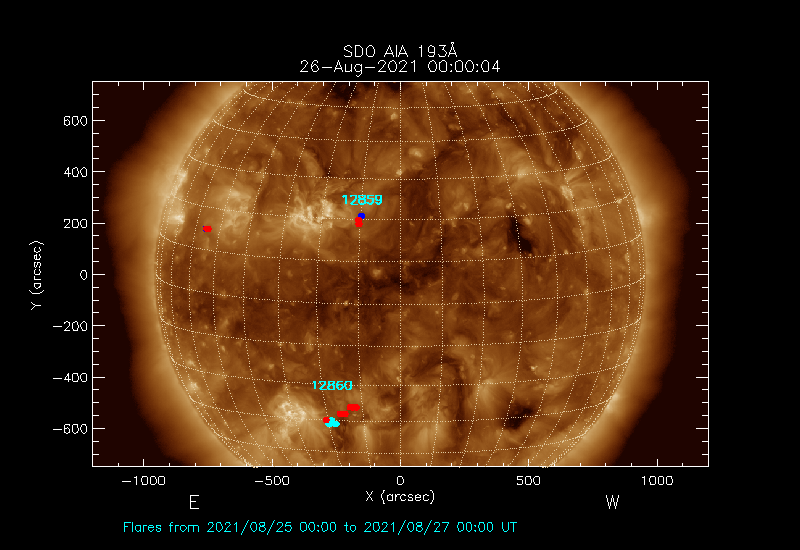 Click on an Active Region plot to display the Region Report including the region evolution and flaring history. HEC Search for NOAA Active Regions (SRS) records for this date and the day before.
