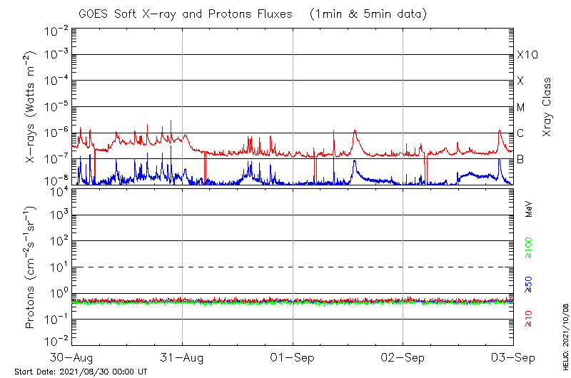This page provides light-curves generated from GOES soft X-ray and Particle data for the date indicated at the top and the preceding three days.