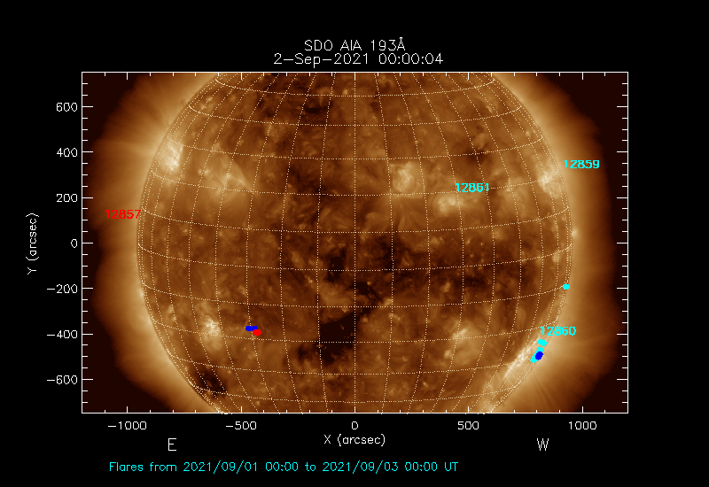 dots and 24-48 hours as turquoise dots; the flare locations are rotated to the time of the image.