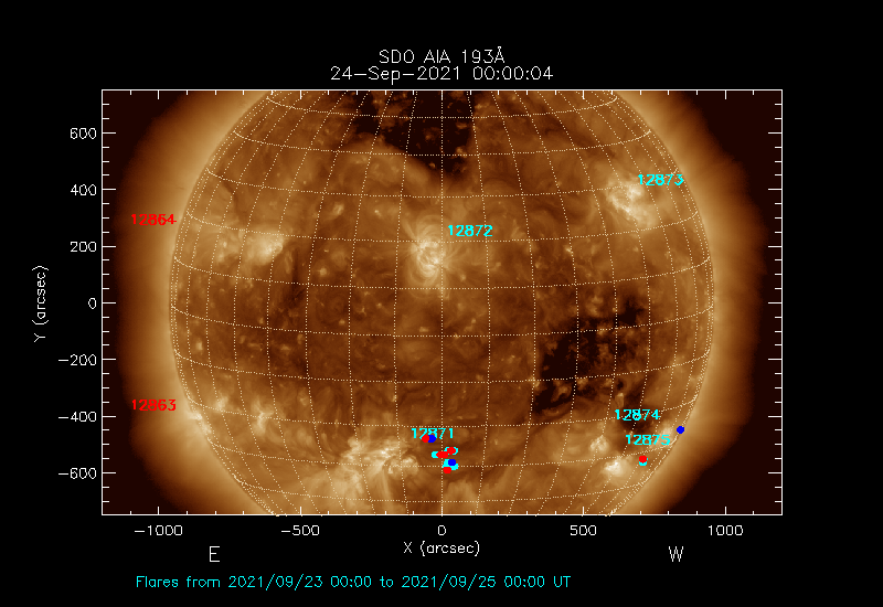 The most recent flares (≤12 hours) are shown as red dots, 12-24 hours ago as blue dots and older ones as turquoise dots.