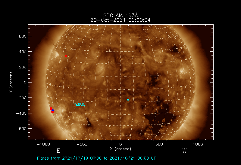 Flares for the 48 hours leading up to the time are over-plotted; these are rotated to the time of the FITS image.