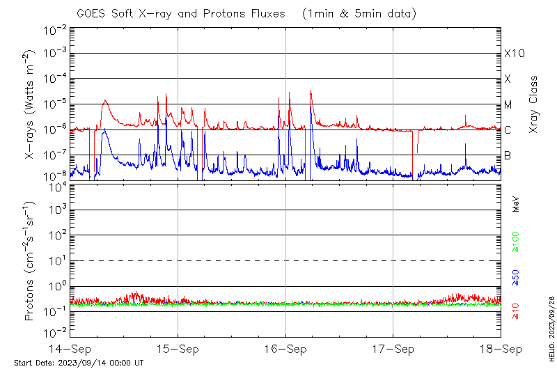 This page provides light-curves generated from GOES soft X-ray and Particle data for the date indicated at the top and the preceding three days.