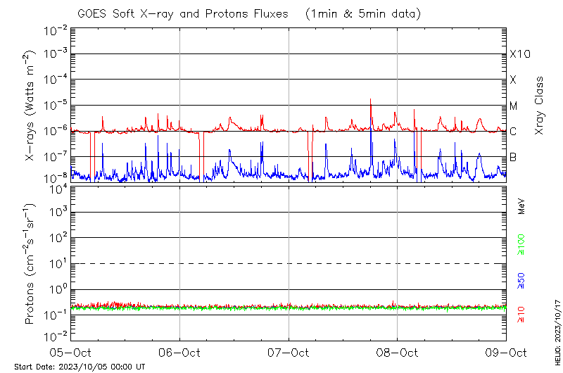 This page provides light-curves generated from GOES soft X-ray and Particle data for the date indicated at the top and the preceding three days.