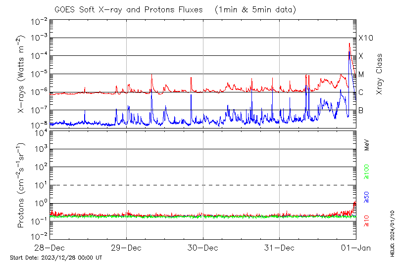 This page provides light-curves generated from GOES soft X-ray and Particle data for the date indicated at the top and the preceding three days.