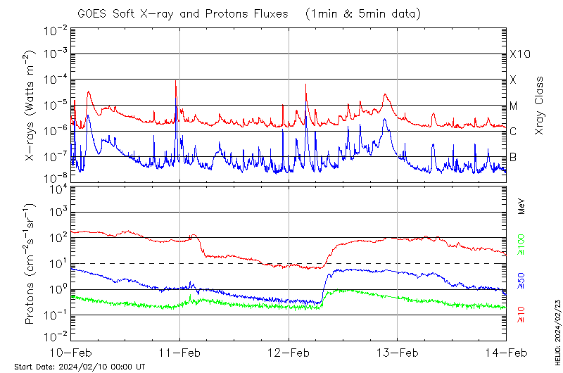 This page provides light-curves generated from GOES soft X-ray and Particle data for the date indicated at the top and the preceding three days.