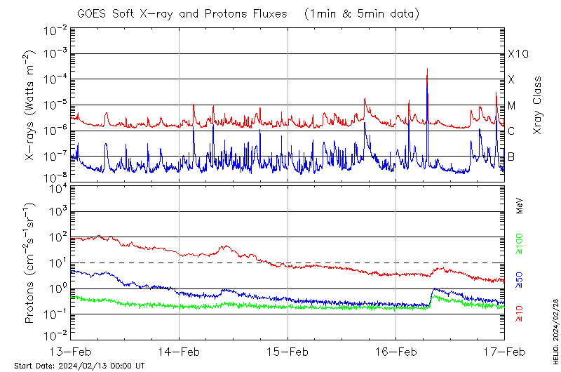 This page provides light-curves generated from GOES soft X-ray and Particle data for the date indicated at the top and the preceding three days.