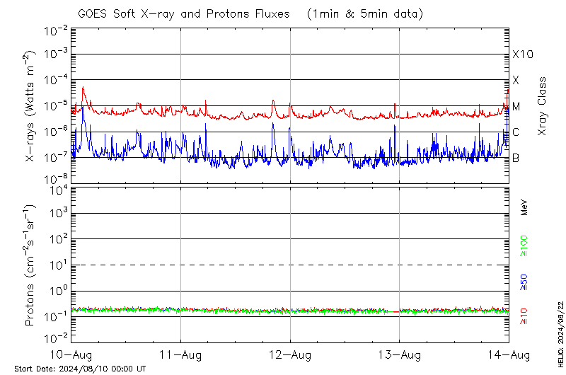 This page provides light-curves generated from GOES soft X-ray and Particle data for the date indicated at the top and the preceding three days.
